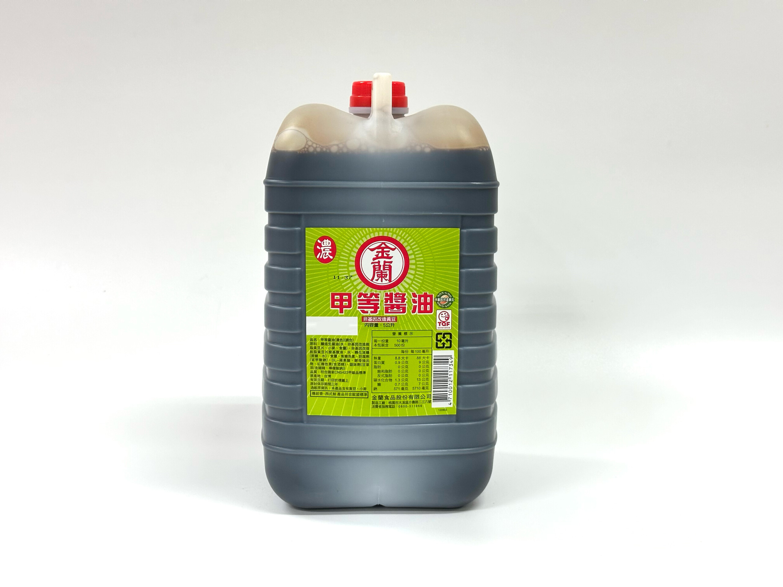 成分:釀造生醬油(水、非基因改造脫脂黃豆片(原料來源非基因改造黃豆)、小麥、食鹽)、非基因改造脫脂黃豆片胺基酸液、水、轉化液糖(蔗糖、水)、食鹽、焦糖色素、防腐劑(苯甲酸鈉)、DL-蘋果酸、酵母抽出物、紅麴色素(含酒精)、甜味劑(甘草萃(含糊精、檸檬酸鈉))